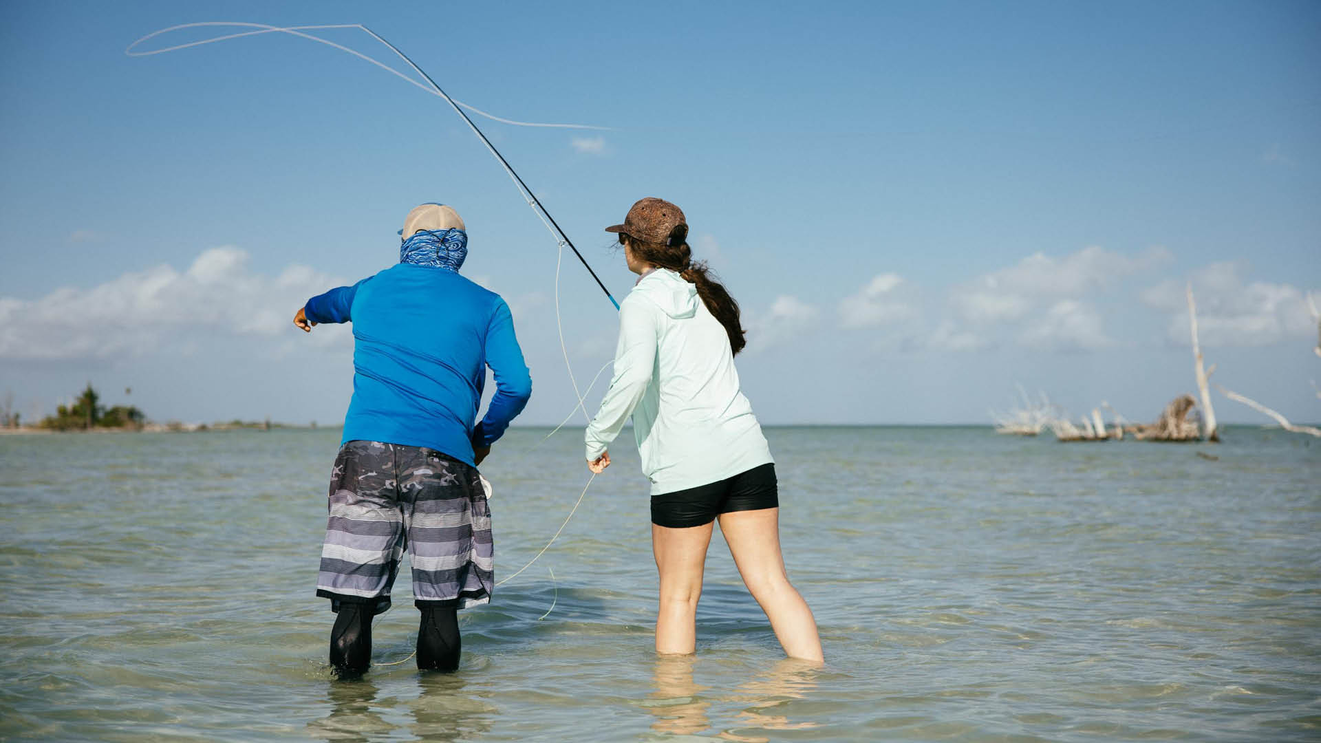 Two fly fishermen catch a bonefish in Ascension Bay, Mexico.