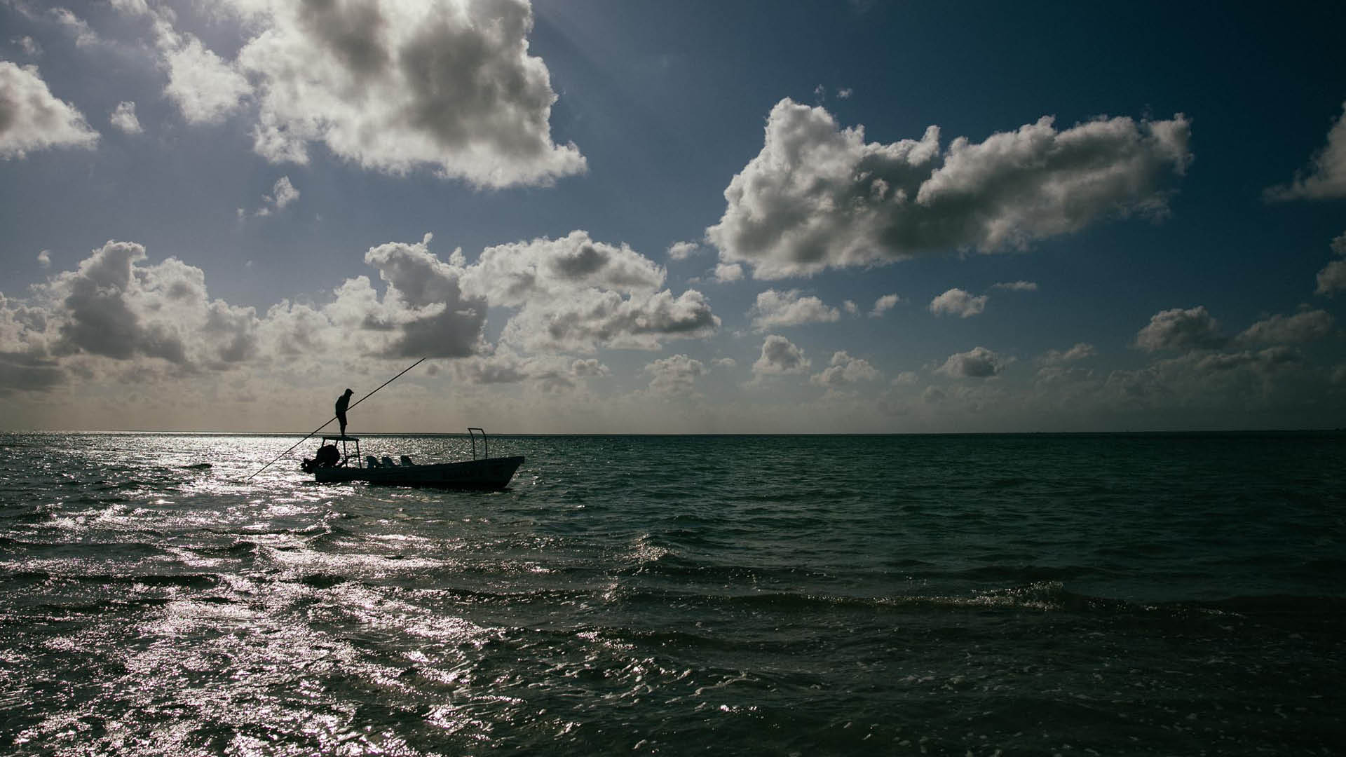Fly fishermen in a panga on the flats of Ascension Bay, Mexico.