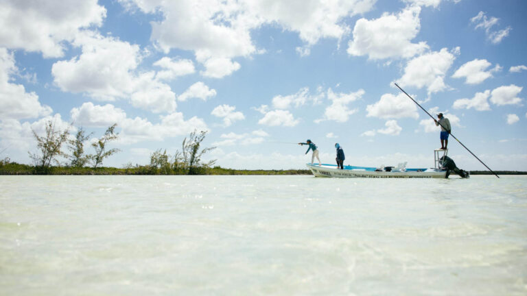 Three people inshore fly fishing in Ascension Bay, Mexico.