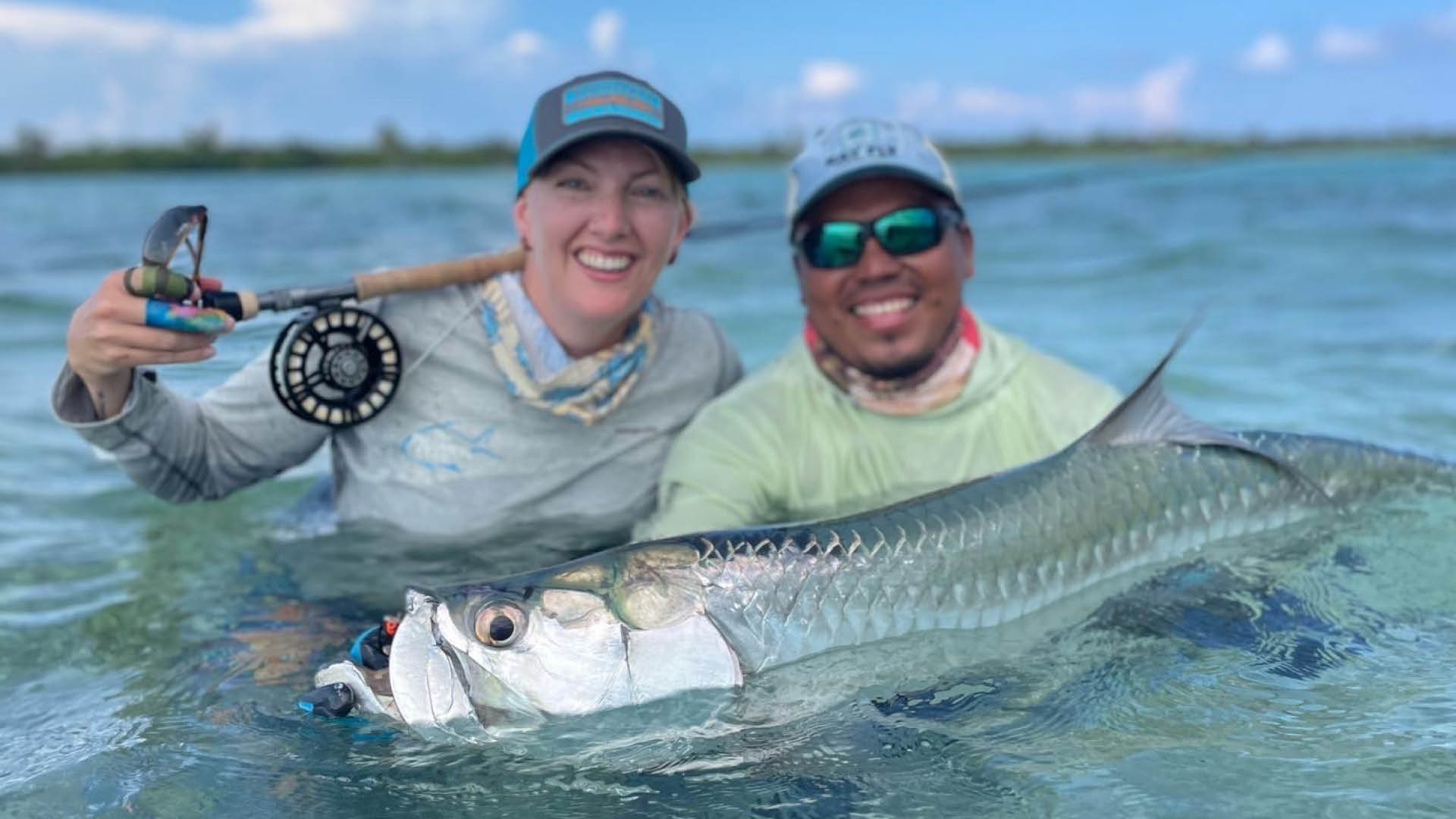 Two fly fishermen catch a tarpon in Ascension Bay, Mexico.