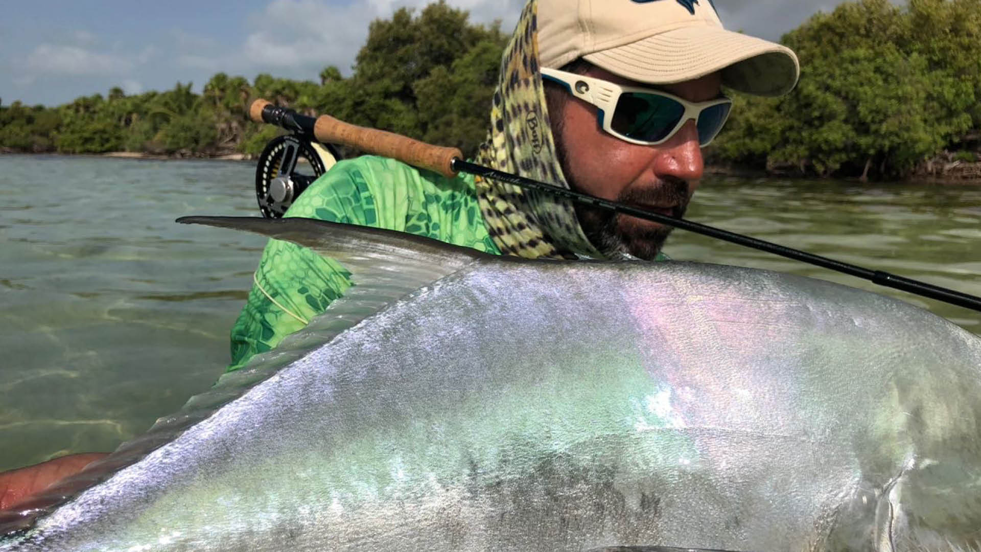 A fly fishermen caught a permit in Ascension Bay, Mexico.