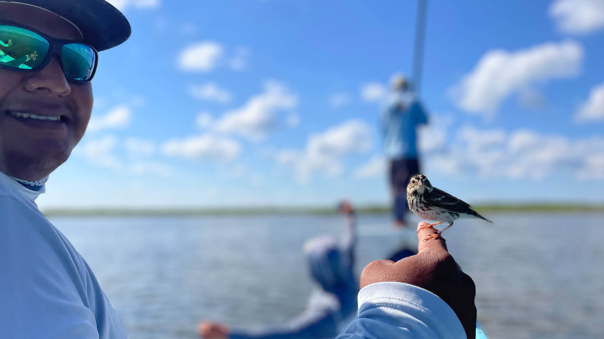 A guide from kay Fly Fishing Lodge has a bird perched on his hand.