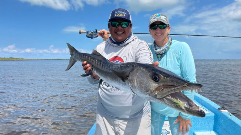A fly fishermen catches a barracuda in Ascension Bay, Mexico.