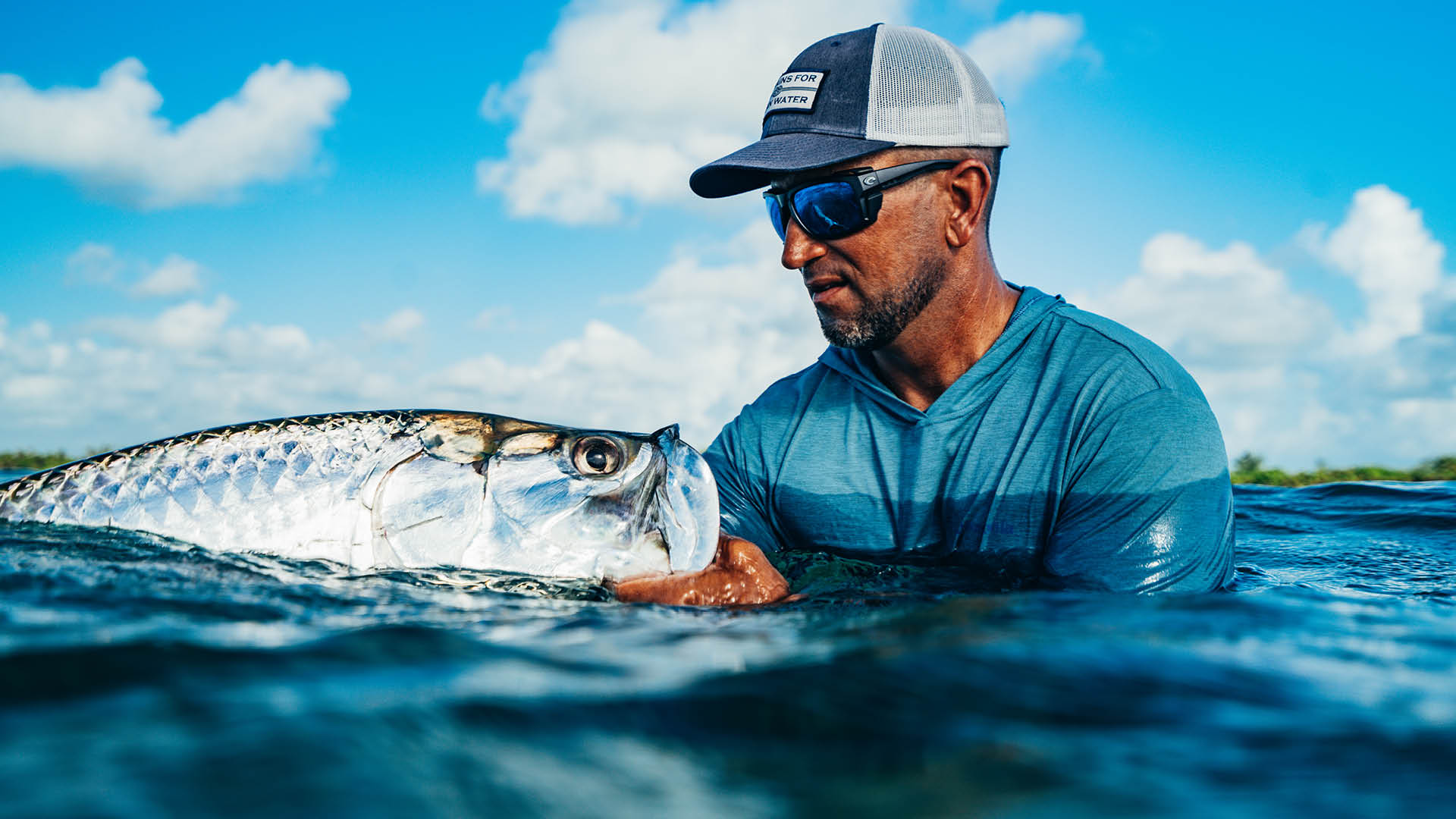 A fly fishermen catches a tarpon in Ascension Bay, Mexico.